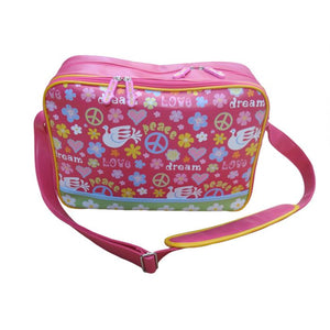 - The front is printed with a cheerful design of peace symbols along with hearts and flowers and some inspirational words.